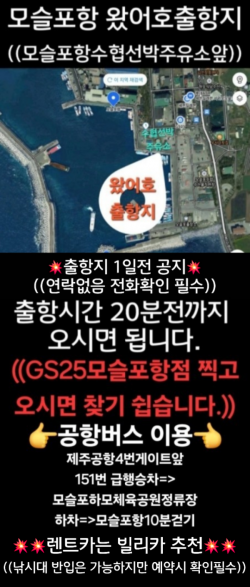 **제주왔어호 야간무늬팁런 조황***100마리두 못찍구왔네요ㅠㅠ*10월 15일 저녁반~16일 새벽반두타임 야간 팁런 조황입니다.모슬항에서 출항했구요.((출항지는 상황에따라 수시로바뀌며,출조당일 아침10시전에 일괄 문자연락 드리겠습니다.))저녁타임은 낚시는 할만했는데 물방향이맞지않아서 기본만했구요.새벽타임은 바람과 너울에 갈수 있는 포인트가많지 않았습니다.어려운 여건속에서 고생해주신 조사님들감사감사합니다.야간에 이젠 조금 시원한 바람이 불어주네요.((가을잠바 챙겨오세요^^))수온은 아직 높아요.25.5도~27도((아직도 높은 수온에 죽는 놈들이 많으니 포인트이동시마다 개인 물통 직접확인해 죽은 놈은 빼주시면 빙장해드립니다))16일 저녁반부터 22일 새벽반까지는기상 악화로 출항취소이구요.22일과 23일은 기상변화지켜보는중 이구요.이후 정상 출항될듯합니다.예약주시면 출항 2일전 출항여부 연락드리겠습니다.*찐~~한 무늬 손맛 보실분 예약주세요^^**전화금지 시간((예약사이트예약))*아침10시~오후5시까지((선장도 잠을 자야 합니다...))**사전 협의없는 동영상촬영 금지**왔어호는 별도의 뜰채를 해드리지 않습니다. ((두분당 한개의 뜰채가 준비 되어 있으니, 작은 사이즈는 직접하시거나 옆 조사님과 도와서 하셔야 합니다.))**여유자리 많으니 예약주세요^^((출항여부는 출항 2일전 확정됩니다.))출항일 : 8월부터 11월말까지((야간팁런))출항지 : 모슬포항((변경시 출항 당일 아침10시이전일괄문자 연락드립니다.혹시 연락 못받으신분은전화확인 부탁드립니다.))출항시간*저녁반:오후 6시 30분 출항 ~ 새벽 00시 30분입항*새벽반:새벽 1시 출항 ~ 아침 7시 입항((한타임 8만원 / 두타임 14만원))**예약 당일 입금없음 자동 취소***뱅기는 제주도착 오후3시가는뱅기는 오전10시 전후 추천*11월말까지 야간무늬 나가니 마니 와주세요^^***왔어호 예약 공지(필독)***((날씨로 인한 출항 가능여부는 2일전.확정됩니다))***자리배정은 승선 후 추첨***80세이상 자리배정후연박자ㆍ4인이상단체 우선추첨☆☆낚시대+릴+에기 대여됩니다.☆☆낚시대+릴 1세트 = 2만원에기 무상대여((손실시=1만원))(낚시대파손과 라인 30%이상 손상추가금액 발생합니다)**무늬 처음 입문하시는분은 몸만 오셔서 체험 후 장비와 에기 구입하시는걸 추천드립니다.(장비와 에기까지 대여됩니다)**무늬 손맛 보러 제주로....이왕이면 왔어호로 와주세요^^ *왔어호 예약바로가기https://welcome.sunsang24.com/ship/schedule_fleet/*왔어호 밴드바로가기/ 더 많은 사진https://www.band.us/band/85207657#제주왔어호 #갑오징어 #제주갑오징어 #제주선상갑오징어 #한치 #한치이카메탈 #제주한치 #제주선상한치 #제주야간팁런 #제주야간무늬팁런 #제주무늬팁런 #제주선상팁런 #제주선상무늬오징어 #제주팁런#제주모슬포 #제주사계 #제주신창 #제주서귀포*** 제주 왔어호***호 예약 안내 ***예약문의 : 010-2853-8252오시는길 : 시즌별 변동 예약 시 확인해주세요홈페이지 : https://welcome.sunsang24.com/왔어호 밴드 : https://band.us/band/85207657 (왔어호밴드가입시 휴대폰 인증으로 해주세요)