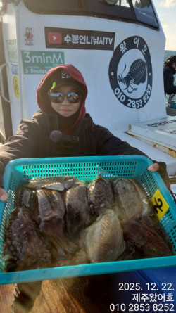 **제주 왔어호 갑오징어 조황**12월 20일(토) 8물 한림권 주간갑오징어조황입니다.2026년 갑오징어 첫 출항 소식 전합니다.첫 출항에 이정도 마릿수와 사이즈면 완죤 만족입니다.장원28마리 전원 두자릿수 하셨네요^^(사진에 모자란건 사이즈가 작아 방생했습니다.)이제 시작이니 점점 사이즈도 마릿수도좋아질꺼 같네요.22일,23일 출항 후 24일과 25일은 기상악화로쉽니다.22일은 기상이 좀센편이라 08시에서 10시 사이 출항합니다.겨울 심해갑이잡으로 출동해보시죠^^봉돌은 납 40호, 텅스텐 35호 통일.낚시대 한대만 사용가능하구요.에기도 하나만 달수 있습니다.꼬~~~옥 지켜주세요...아침 시작은 보라로 시작하시는게 좋을듯 합니다.,오늘도 보라가 하루종일 잘먹힌 하루네요^^초보분들은 종일 보라 권해드립니다^^수온18.3도오늘첫 출항에 하루종일 쉬지도 않고,열심히 잡아주신 울 조사님들 감사감사합니다.왔어호와 함께 찐~~한 갑오징어손맛 보실 조사님들 아래 예약사이트로마니마니 예약주세요.출 항 일 : 기상만 허락한다면 1분이라도출 항 지 : 한림항(3월말일까지)출항시간 : 06시 30분(항에 06시10분까지)입항시간 : 17시 30분(저녁8시30분 이후 뱅기)1인 선비 : 12만원**픽업 안됩니다**5월 말까지 주간 갑오징어 출항합니다.많은 이용 부탁드립니다.마니마니 도와주세요^^**배 전원사용가능**((배터리 챙겨오시는거 추천)) ***자리배정은 승선 후 추첨***0.80세 이상 어르신 우선권.1.연박자 우선 추첨(2일째부터 적용)2.단체 우선 추첨(4인이상 한줄서기)3.개인추첨항에서 배를 봤을때 좌측선수에서 1~9번우측선수에서 1~9번 입니다.(1,2번빼고는 평지 입니다.)갑이 손맛 보러 제주로....이왕이면 왔어호로 와주세요 ^^*1월~5월 갑오징어 출항 시간**아침 6시 30분 출항 ~오후 5시 30분 입항((가는 뱅기는 20시30분이후 권해드립니다))*아침새참과 점심 제공해드립니다.(컵라면과 물, 몇가지 음료 준비되어 있음)*왔어호 예약바로가기https://welcome.sunsang24.com/ship/schedule_fleet/*왔어호 밴드바로가기/ 더 많은 사진https://www.band.us/band/85207657네이버검색 : 제주왔어호, 왔어호, 제주 왔어호 크리스마스 다가온다구 산타께서 와주셨네요.미리 메리크리스마스 입니다^^왔어호 마지막 시메 후 뿔까지 잘라드립니다.왜냐구요?마지막 들어올때 까지 한마리라두 더 잡으시게해드리고 싶어서요...*연박 한림항 숙박추천**복층형펜션(기상악화 100프로 환급)*((잡은갑이로 저녁식사되는곳))바사팬스파펜션((010 9916 9811))(한경해안로 448-6)2인 6만원에 복층형 펜션 입니다.((1인 추가 1.5만원)1층식당에서 잡은 갑이 가져가시면1인2만원(추가1인1만5천원)갑이회,튀김,무침,탕해주신다고 합니다.한림항에서 차로 15분거리에아침에 한림항까지유료픽업해준다구 합니다.방이5개뿐이니 미리미리 예약하셔야 합니다.**한림항 숙박 추천 순서**더퍼스트호텔 064-796-6950자몽호텔 064-796-1121비양도모텔 064-796-5851한라모텔 064-796-79423만8천모텔 064-796-0181*기상악화시 숙소는 환급 안되는 곳 많음.*((예약시 미리 낚시객이라 하시고 기상악화로 출항 못하면 환급되는지 확인하세요))#제주왔어호 #갑오징어 #제주갑오징어 #제주선상갑오징어 #한치 #한치이카메탈 #제주한치 #제주선상한치 #제주야간팁런 #제주야간무늬팁런 #제주무늬팁런 #제주선상팁런 #제주선상무늬오징어 #제주팁런 #제주모슬포 #제주사계 #제주신창 #제주서귀포*** 제주 왔어호***호 예약 안내 ***예약문의 : 010-2853-8252오시는길 : 시즌별 변동 예약 시 확인해주세요홈페이지 : https://welcome.sunsang24.com/왔어호 밴드 : https://band.us/band/85207657 (왔어호밴드가입시 휴대폰 인증으로 해주세요)